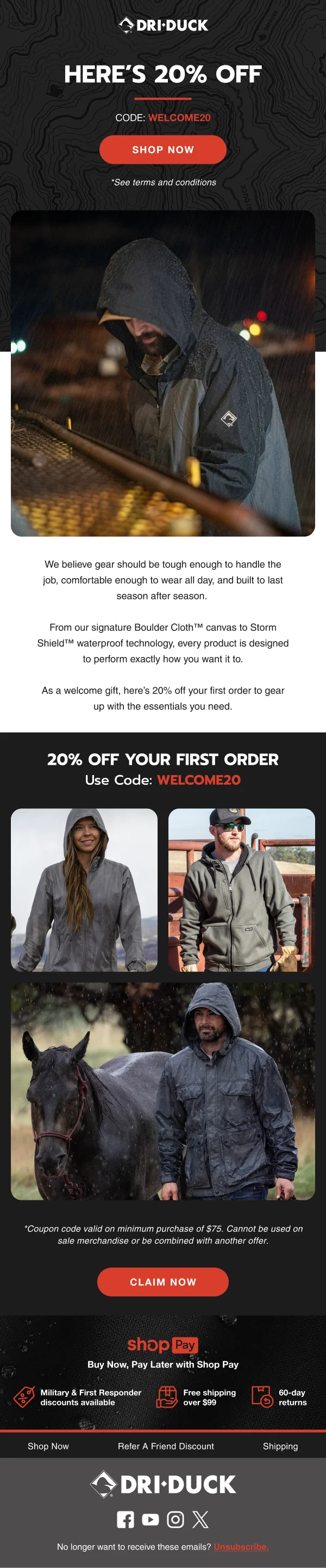 - Discount code is impossible to miss — "HERE'S YOUR 20% OFF" is the headline, code WELCOME20 is right there