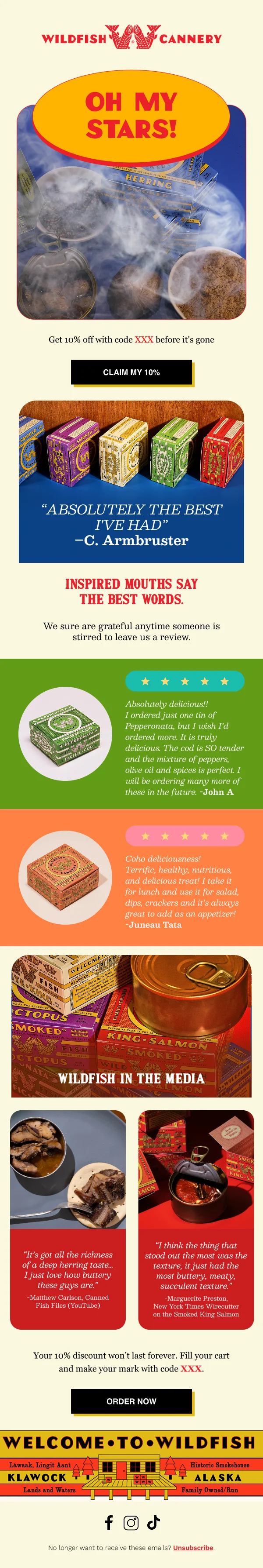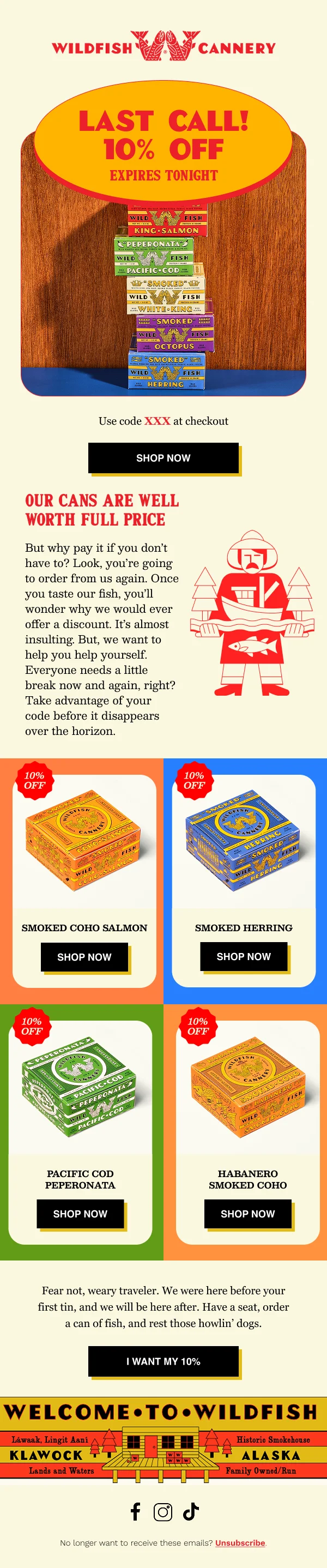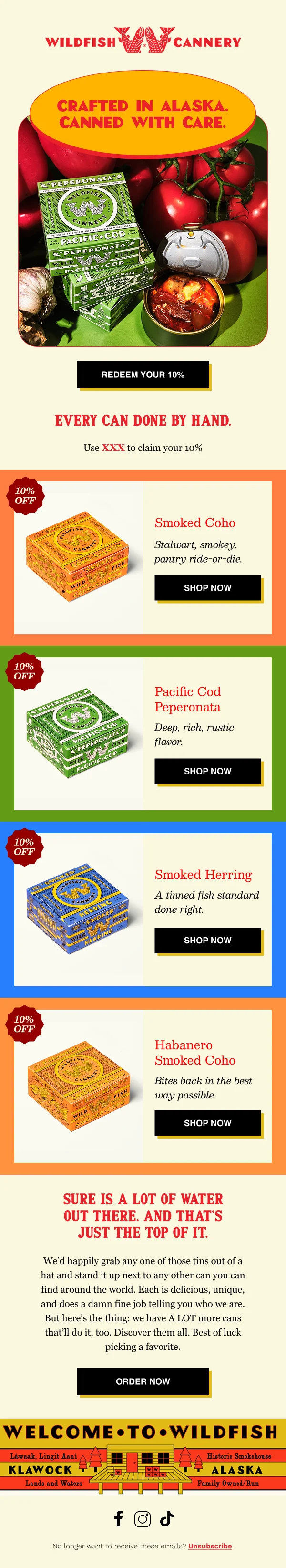 - Each email has a distinct job — "Welcome to the Table," "Crafted in Alaska," "Oh My Stars" (reviews), "Wildfish Cannery Lore" (story), and "Last Call!" No two emails repeat the same angle