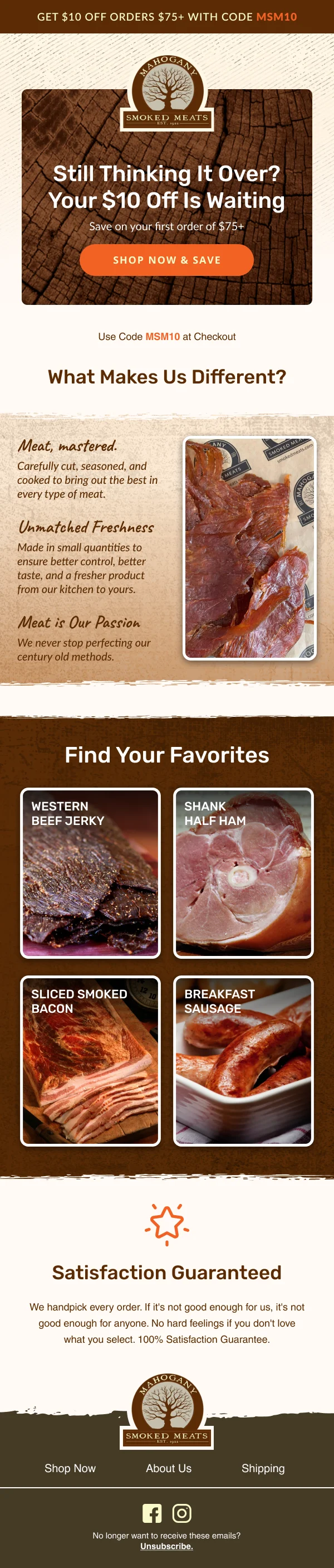 - Discount code reminder is woven in naturally ("Use XXX to claim your 10%") — not buried, not screaming