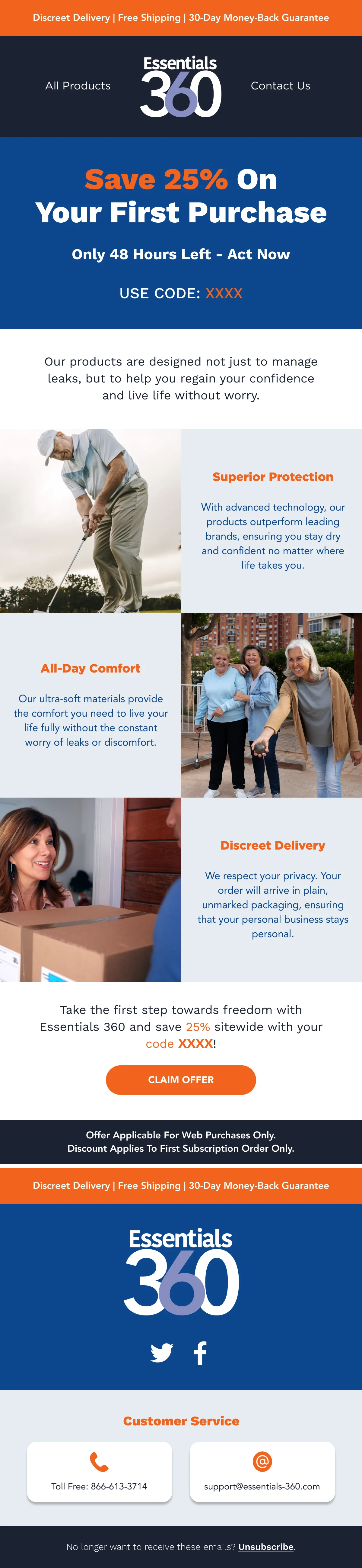 - Positions the product as the solution to their problem, not a generic pitch ("designed not just to manage leaks, but to help you regain your confidence")