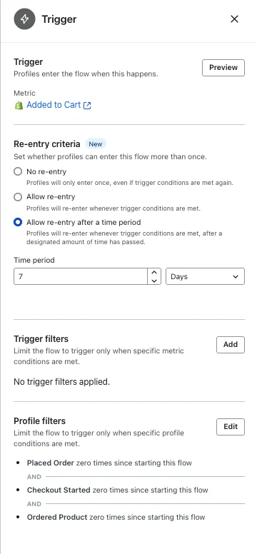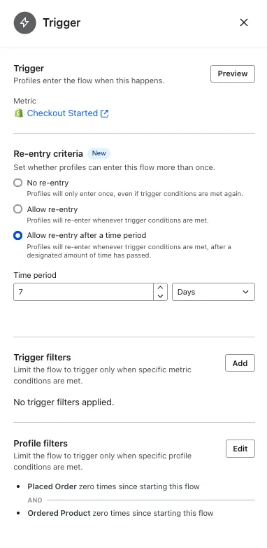 - Flow filters: Has not placed order since entering this flow. Has not started checkout since entering this flow.